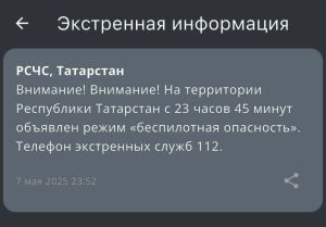 МЧС в 23.45 объявило на территории Республики Татарстан угрозу атаки БПЛА.